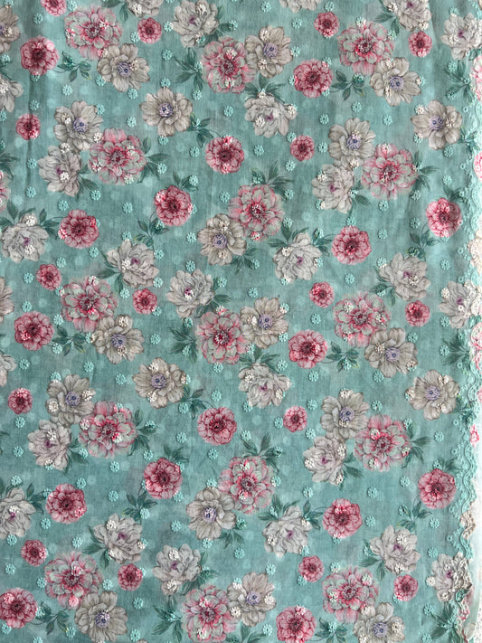 Teal Blue Floral Embroidered Cotton Voile Fabric