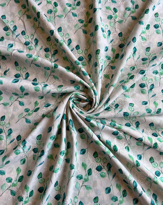 White Cotton Embroidered Fabric with Rama Leaf Print