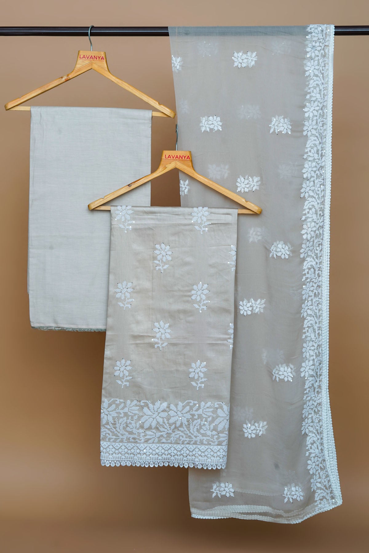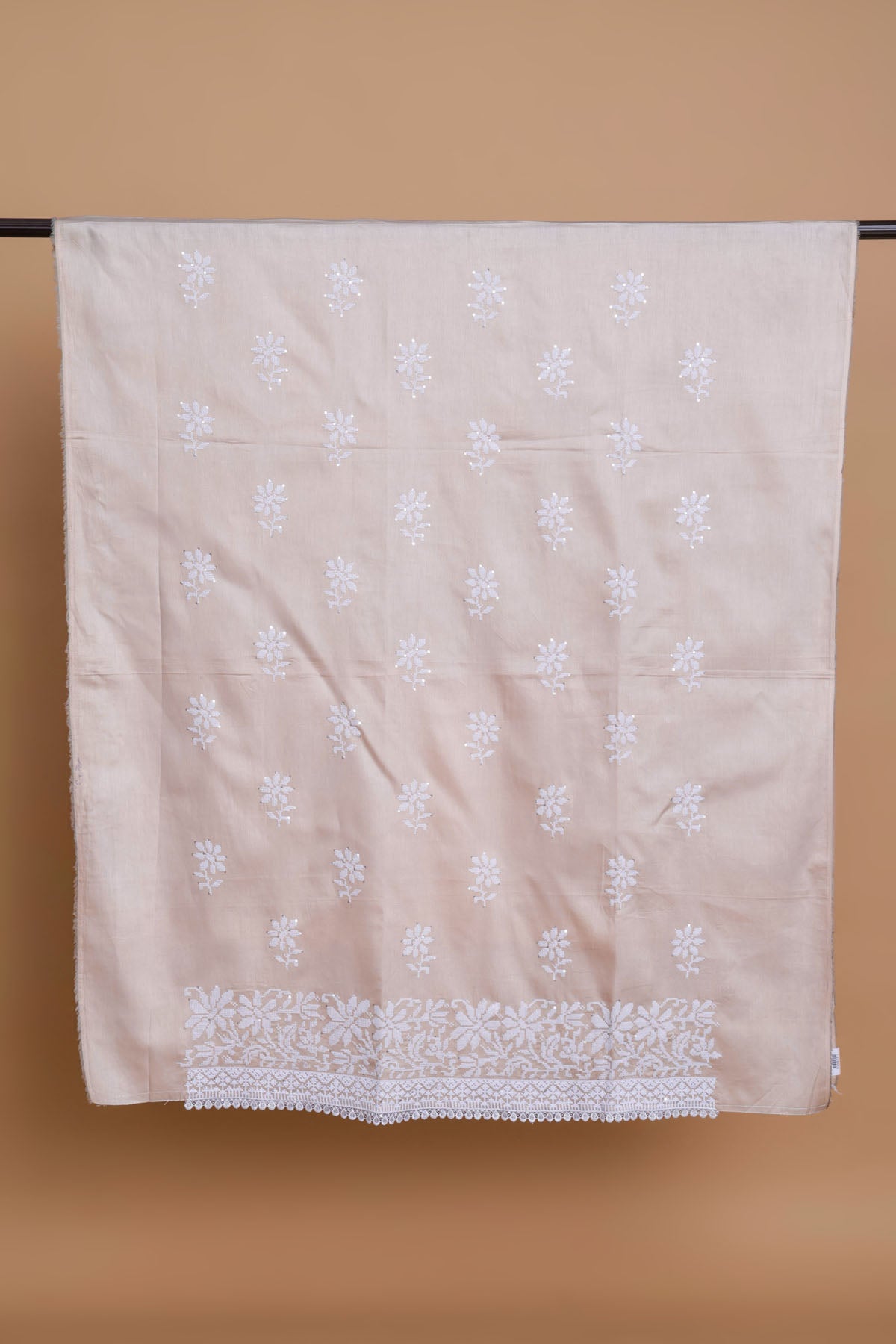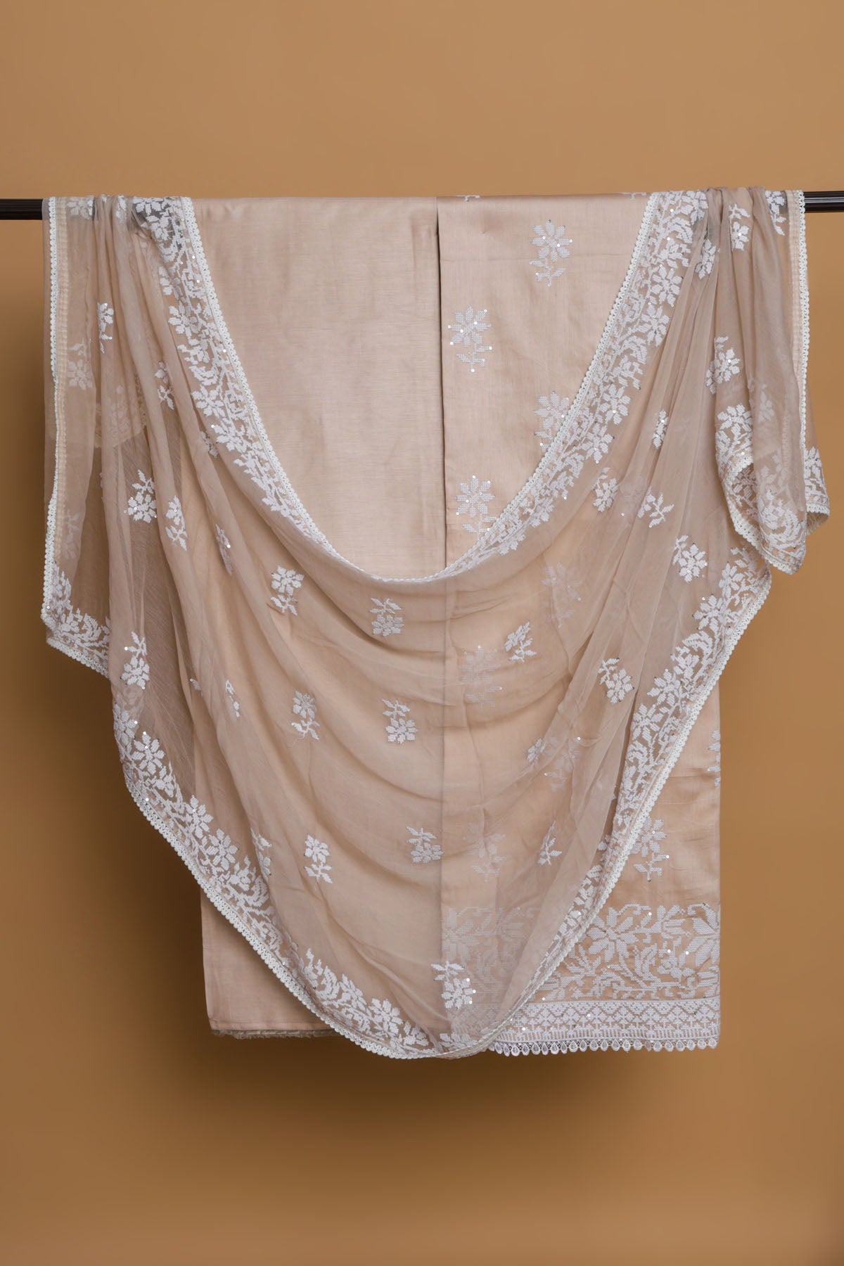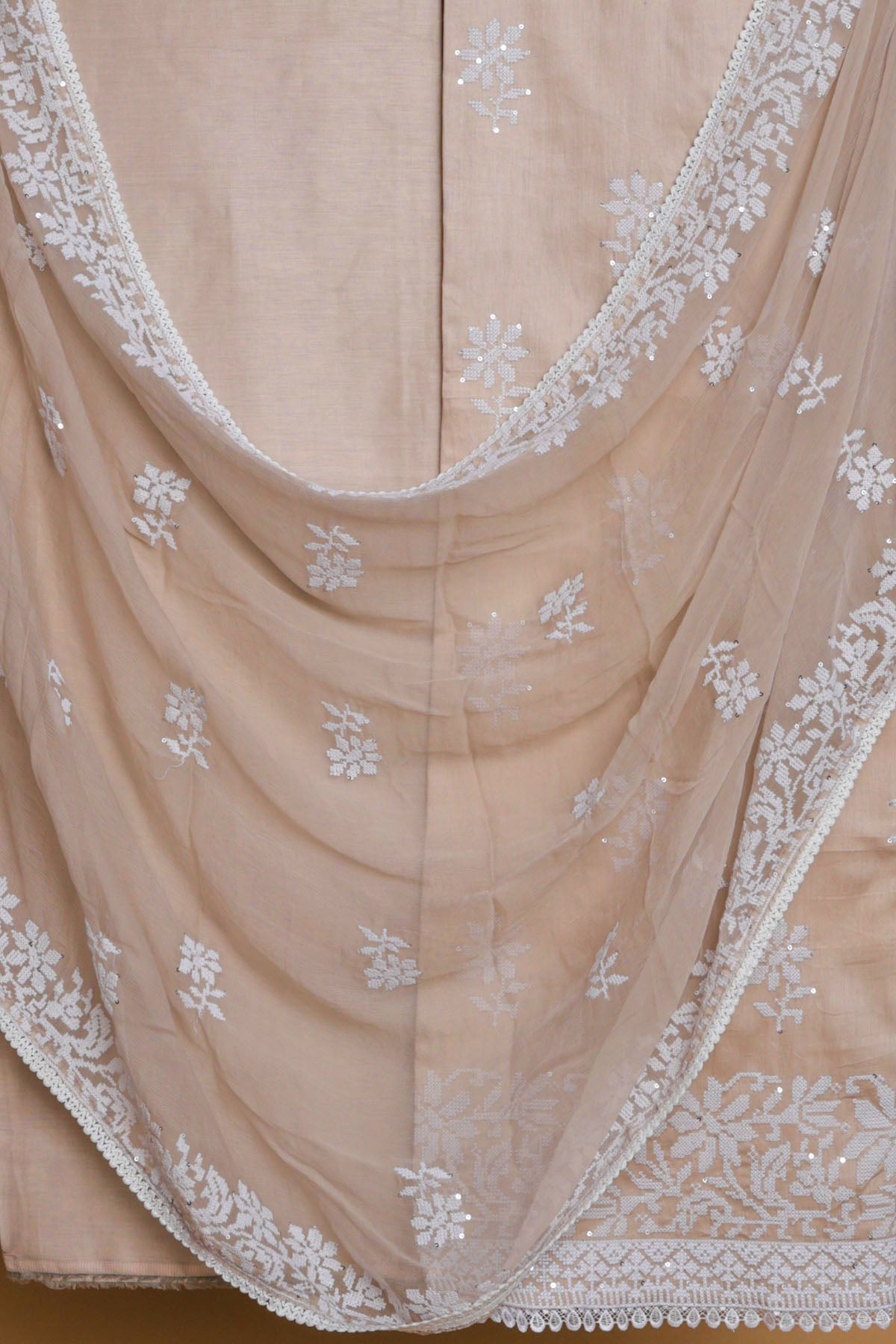 Beige Glace Cotton Embroidered Suit with Embroidered Chiffon Dupatta