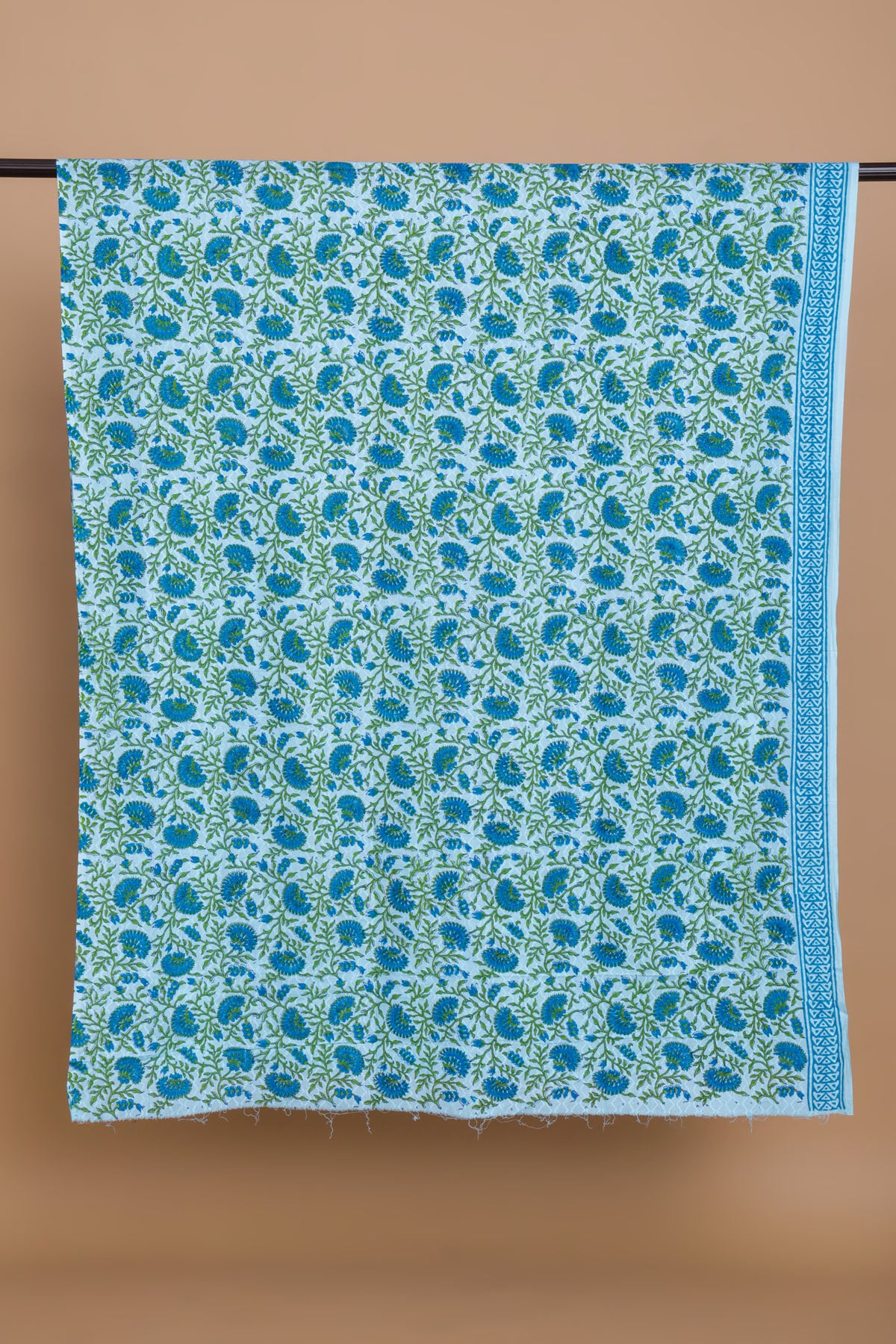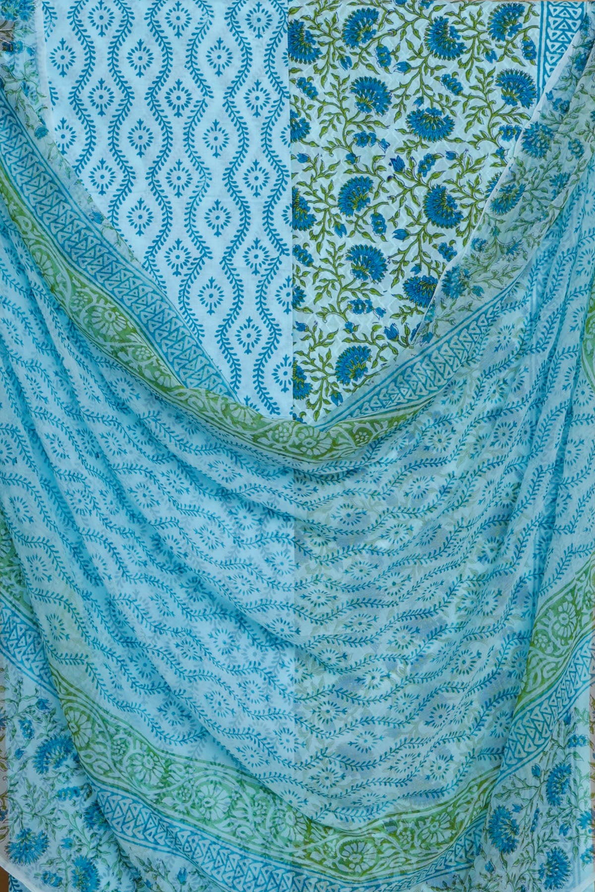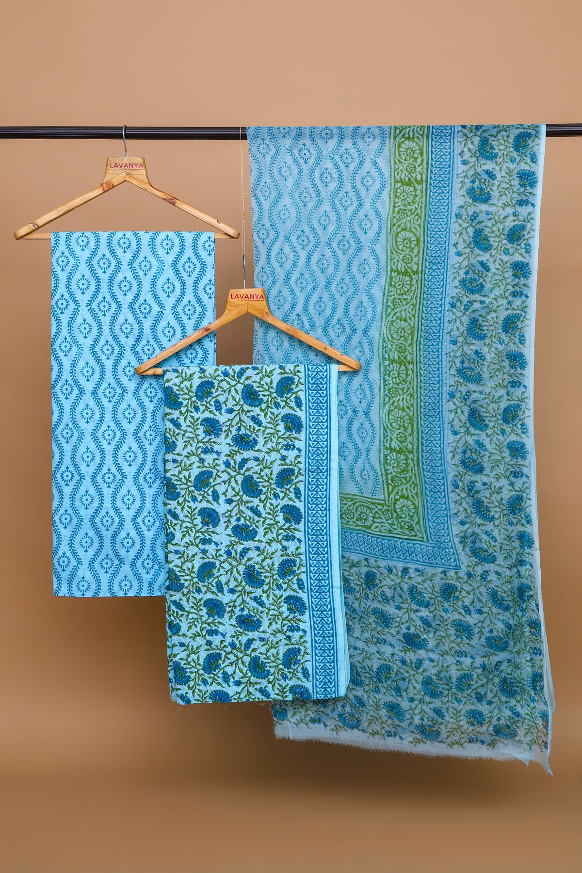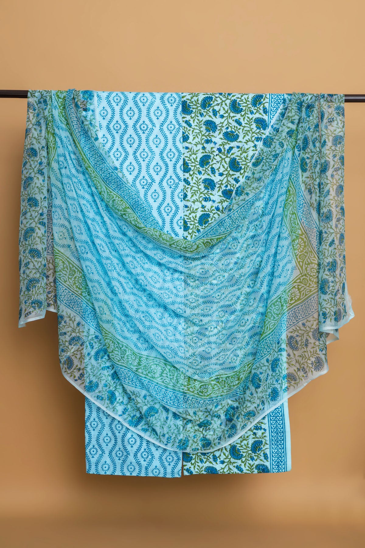 Blue Cotton Hand Block Printed Suit with Chiffon Dupatta