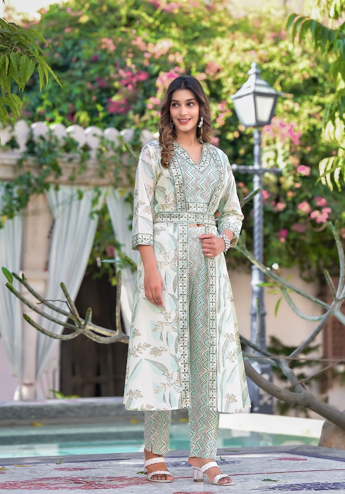 | This Green Coord Set will add a touch of charm to your wardrobe. The outfit is paired with a shrug and a belt. |