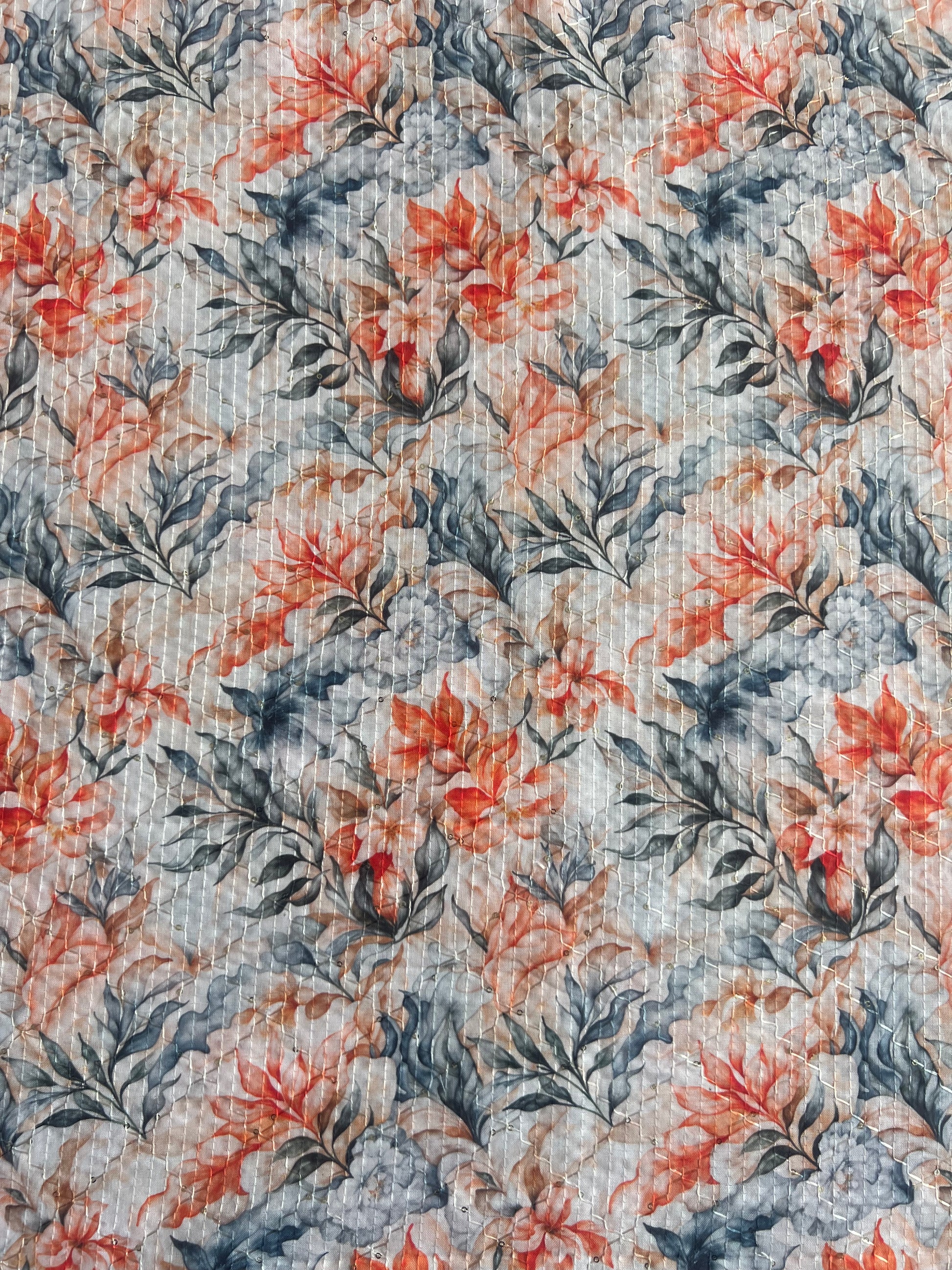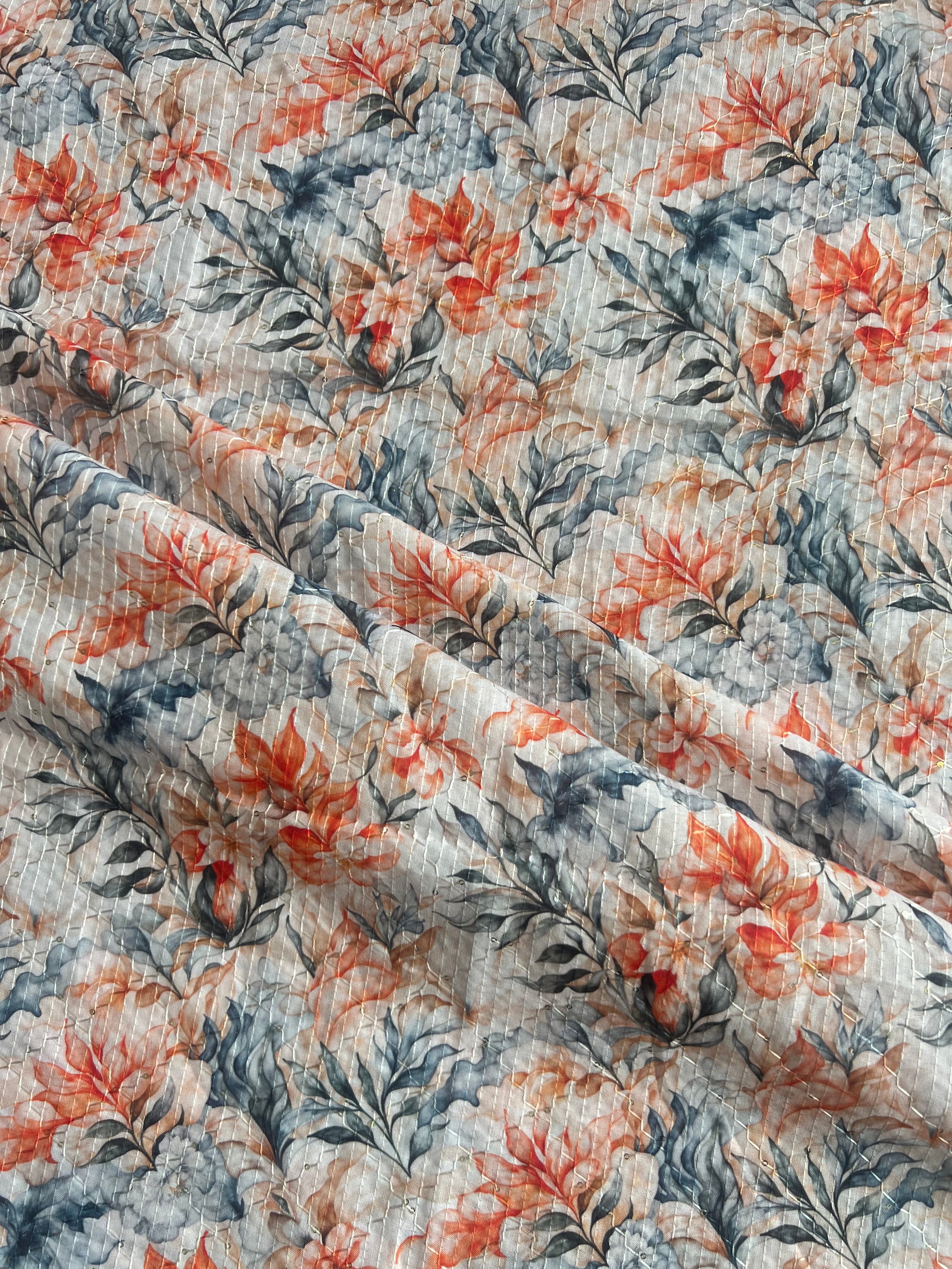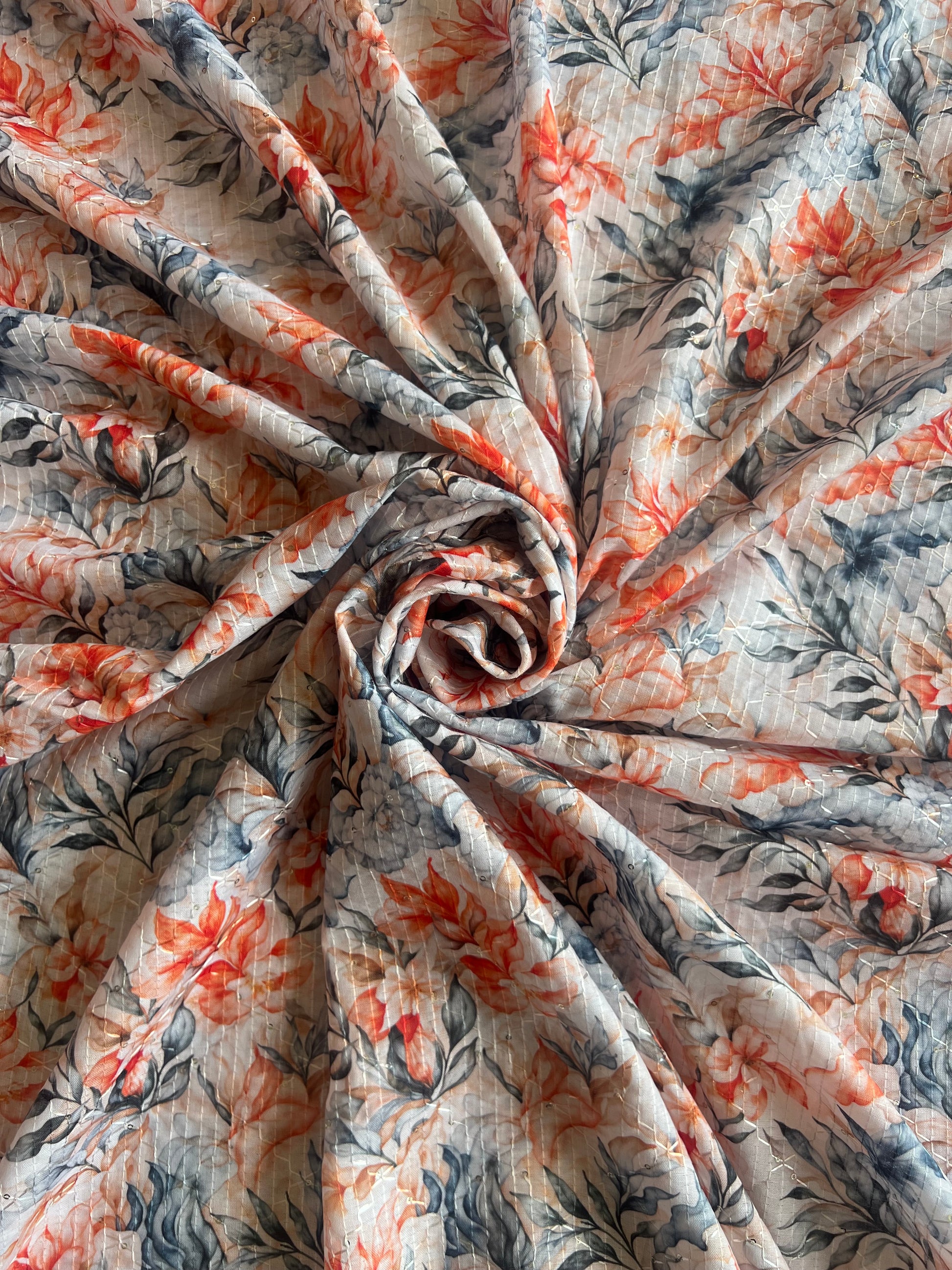 Orange Floral Self Sequence Work Printed Fabric